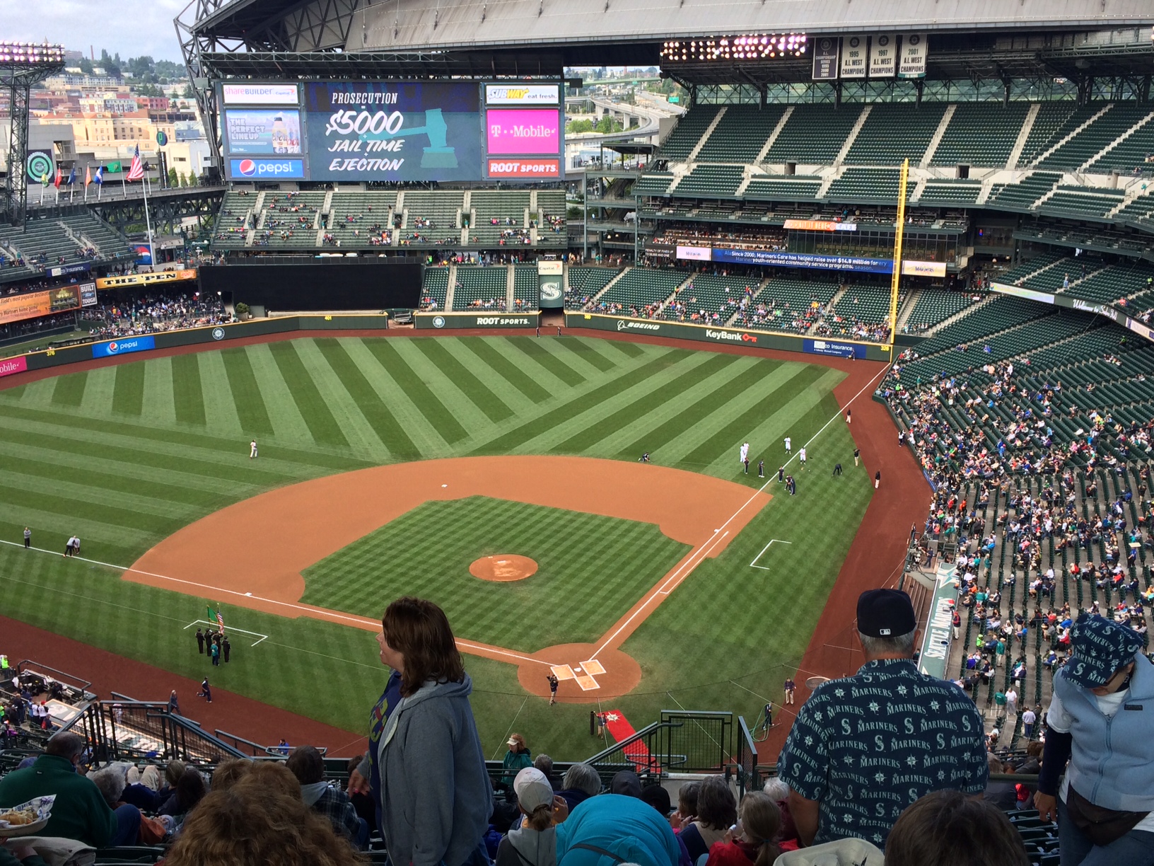 Hi friends. It has been a great summer with opportunities to travel locally to Stitch and Pitch events at Cheney Stadium in Tacoma, and Safeco Field in Seattle. I took my two teens with me to watch the Mariners play the Baltimore Orioles one summer evening, with the bonus that we could sample the food AND the yarn on the way. We were all joking in the car that the last minute tickets we purchased would probably be in the nosebleed section. After indulging in some treats and looking at lots of beautiful fiber we trekked into the stadium to find those seats. Up and up and up, I could hardly climb the stairs I was laughing so hard. Yep, we were in the very last row of the very top tier, so high up we could turn around and take pictures of the Port of Seattle behind us.