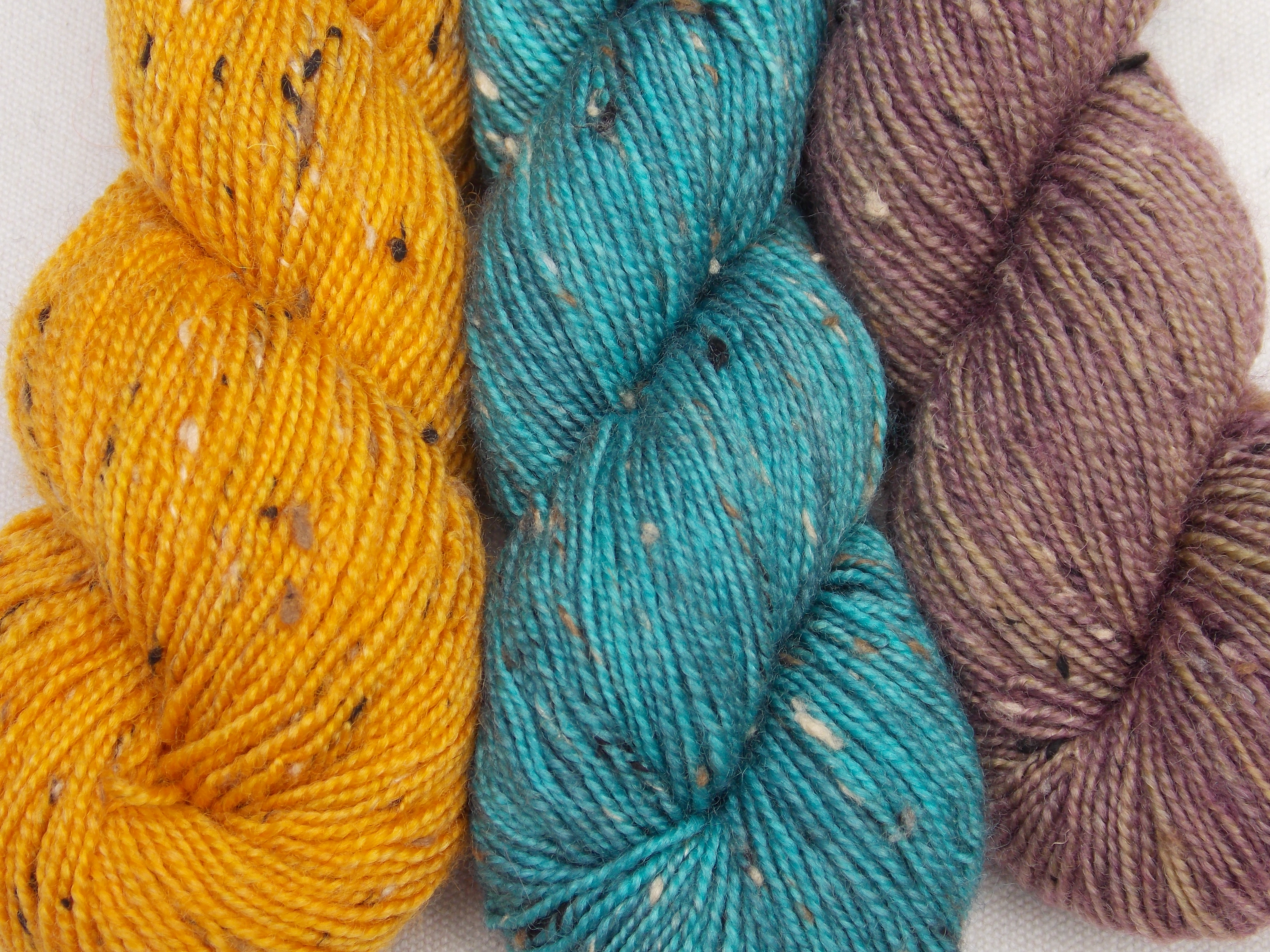 I will have more of the popular Tweed Sock yarn, dyed in great colors, as well as a new yarn with the same donegal-style bits spun in the fiber, Tweed DK in 100% Superwash Merino. This is a high-twist yarn of exceptional quality. If you are looking for something different for your projects, or exploring the idea of a knitted sweater or scarf as a holiday gift for a man, this yarn with the tweed effect may be what makes it outstanding. It will appear rugged and rustic, but the feel is luscious and soft because of the merino – no complaints about “it itches” here. This is a good time to plan and start gift projects to complete them in time for the holiday season, so I hope you will stop by with your ideas and see what we have.